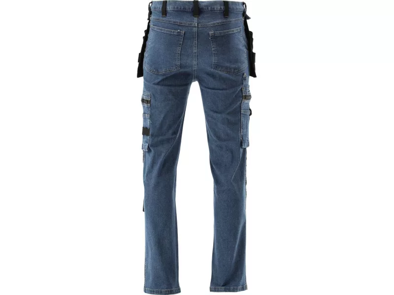 Fitter's work trousers with elastane made of rubbed and stretch denim. As many as seventeen pockets, including one with a Velcro fastening, two with a zip fastening and two detachable mounting pockets. A large number of basic pockets and fitting pockets made of robust material will help organise the work of a carpenter, roofer or plumber.