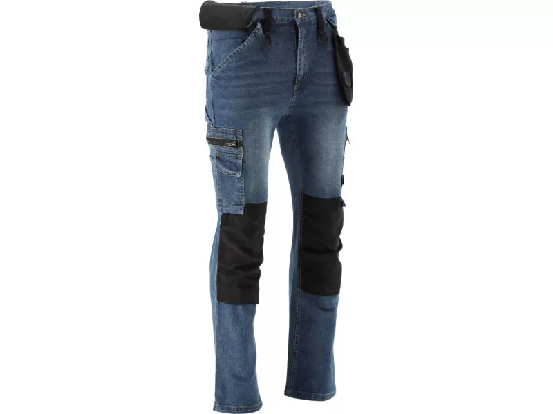 Work trousers for installers made with elastane from worn and stretchable denim. A total of seventeen pockets, including one with a Velcro closure, two with zippers, and two detachable installer pockets. The large number of basic pockets and the durable material of the installer pockets will help organize the work of carpenters, roofers, or plumbers.