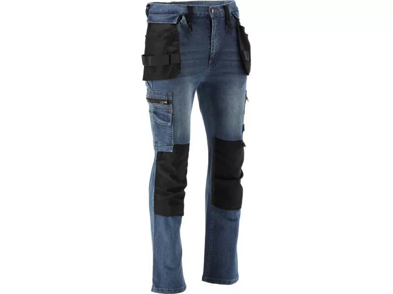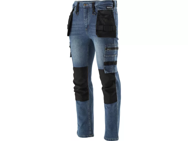 Work trousers for installers made with elastane from worn and stretchable denim. A total of seventeen pockets, including one with a Velcro closure, two with zippers, and two detachable installer pockets. The large number of basic pockets and the durable material of the installer pockets will help organize the work of carpenters, roofers, or plumbers.