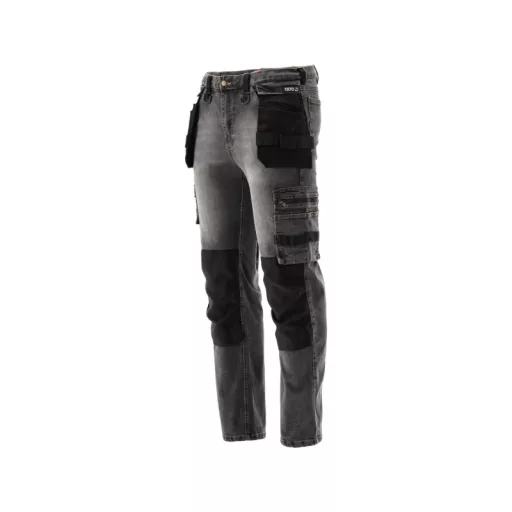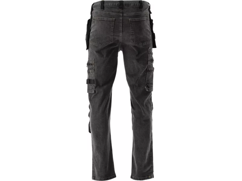 Fitter's work trousers with elastane made of rubbed and stretch denim. As many as seventeen pockets, including one with a Velcro fastening, two with a zip fastening and two detachable mounting pockets. A large number of basic pockets and assembler pockets in robust material will help organise the work of the carpenter, roofer or plumber.