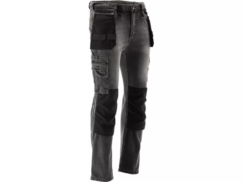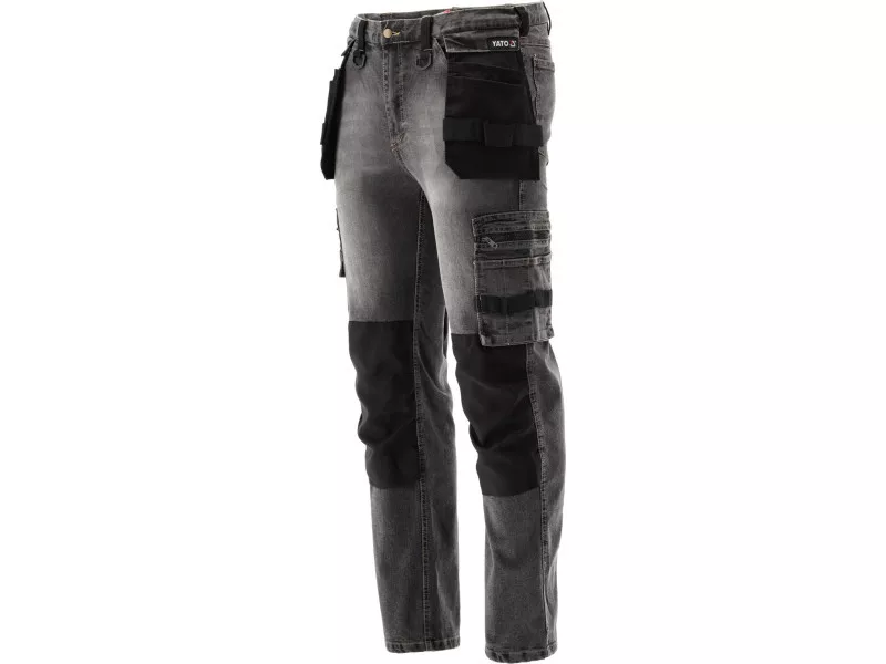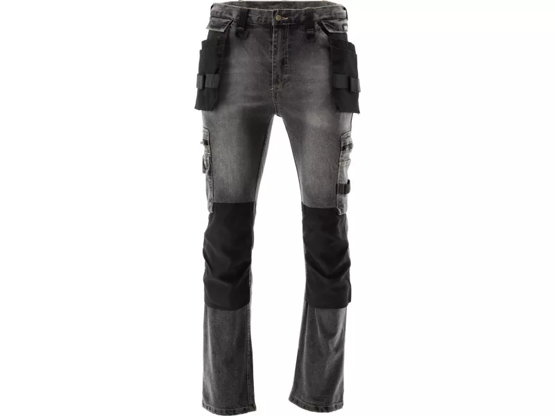 Fitter's work trousers with elastane made of rubbed and stretch denim. As many as seventeen pockets, including one with a Velcro fastening, two with a zip fastening and two detachable mounting pockets. A large number of basic pockets and assembler pockets in robust material will help organise the work of the carpenter, roofer or plumber.