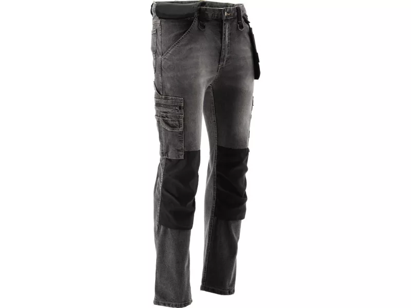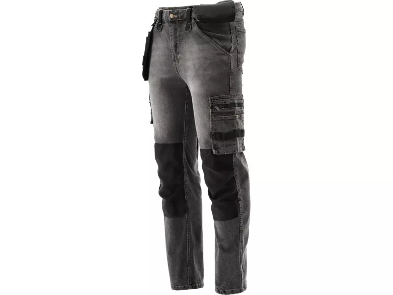Fitter's work trousers with elastane made of rubbed and stretch denim. As many as seventeen pockets, including one with a Velcro fastening, two with a zip fastening and two detachable mounting pockets. A large number of basic pockets and assembler pockets in robust material will help organise the work of the carpenter, roofer or plumber.
