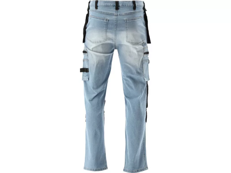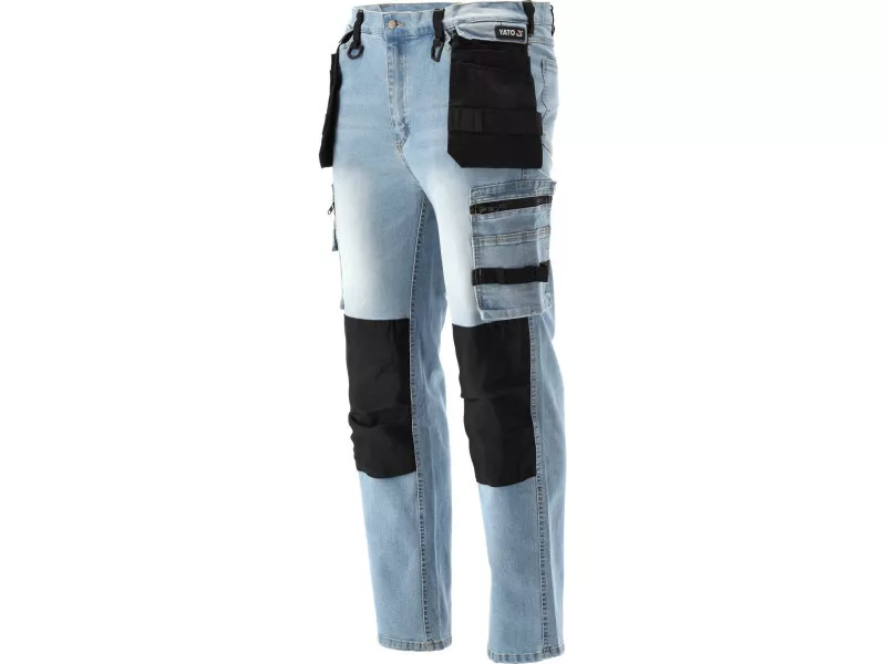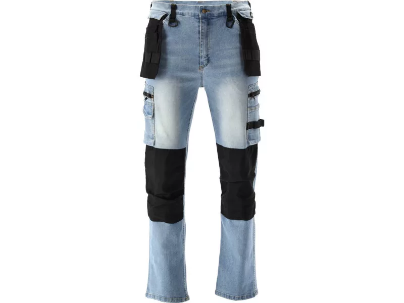 Work trousers for installers made of stretch denim with elastane. Featuring a total of seventeen pockets, including one with a Velcro closure, two with zippers, and two detachable tool pockets. The large number of basic pockets and durable material tool pockets will assist in organizing the work of carpenters, roofers, or plumbers.