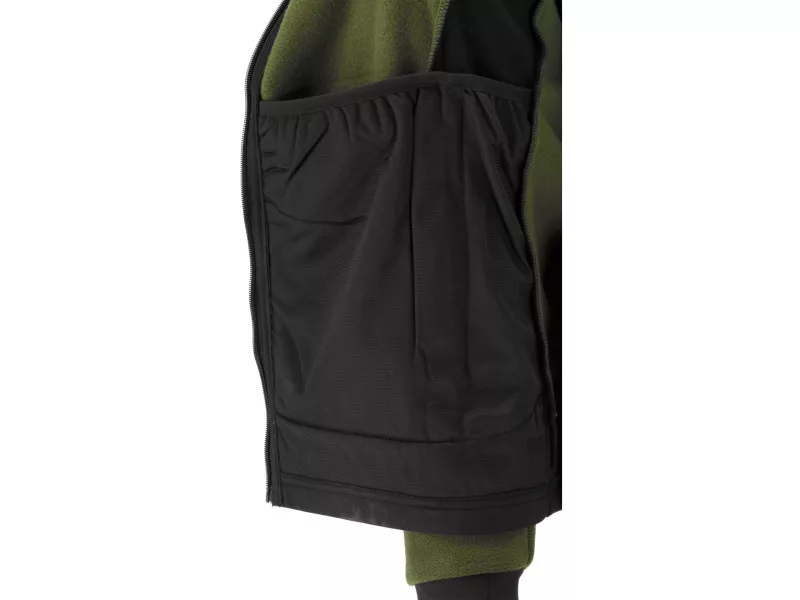- Stretchy 2-way stretch fabric on the sides, under the armpits, and partially on the bottom of the sleeves almost eliminates the discomfort of traditional fleeces, e.g. during torso twists or overhead arm work. It also provides better air circulation, resulting in less sweating, especially under the armpits.