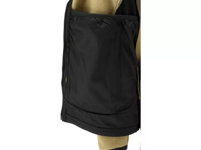The main material is durable polyester with the characteristic structure of fleece, which effectively retains body heat. The insert material is stretchy, breathable 2-way stretch fabric. It does not restrict movement and is pleasant for the skin.