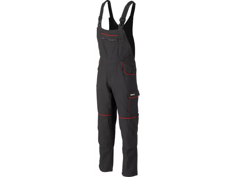 Nine pockets, including a large chest pocket with a zipper closure and a loop for a hammer, will help in organizing work. Material braces with adjustment and elastic tape at the back. Buttons with width adjustment on the sides, and an elastic drawstring sewn at the back of the waist. Knee pockets with Velcro closure. Pants in a dark color with red lines, which, in addition to their decorative function, strengthen and protect the edges of the open pockets from tearing.