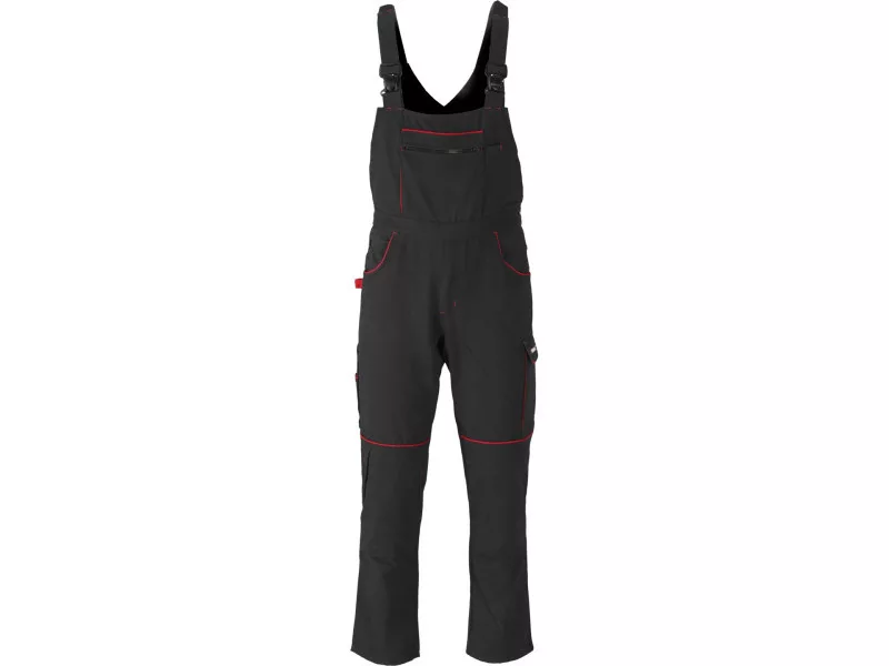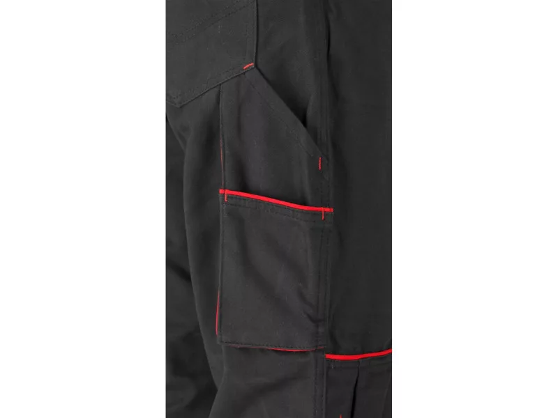 Nine pockets, including a large chest pocket with a zipper closure and a loop for a hammer, will help in organizing work. Material braces with adjustment and elastic tape at the back. Buttons with width adjustment on the sides, and an elastic drawstring sewn at the back of the waist. Knee pockets with Velcro closure. Pants in a dark color with red lines, which, in addition to their decorative function, strengthen and protect the edges of the open pockets from tearing.