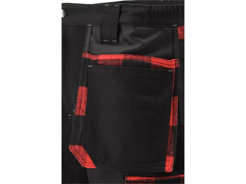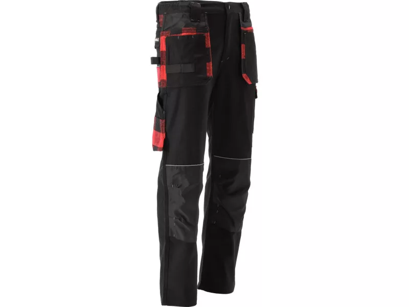 Mounting pants with elastane with fourteen pockets, including two with a Velcro fastener and one for a latch. A large amount of basic pockets and assembly pockets made of durable material will help organize a carpenter, roofer or plumbing in the organization. The main material is cotton with the addition of elastane. Cotton as a natural material is very well tolerated by the body, the skin breathes well, and with a sufficiently large weight and technique of weaving and sewing, satisfactory resistance to tear is obtained. Another of the advantages is a higher degree of protection against sparks derived, e.g. from metal cutting compared to plastic materials. Elastane affects the extension and makes the pants better adapt to the body. Red-white flannel material on pockets has a decorative function, while at the back under the belt improves comfort, fit and thermal properties in this part of the body. Basic data: material: 97% cotton, 3% elastane Weight: 300 g/m² work organization: below the belt at the front two multi-assembly with a total of 6 pockets and two loops for tools under assembly pockets two large main pockets on the left leg Two pockets with a flap, fastened with Velcro on the right leg two narrow pockets, e.g. for a knife and a wooden measuring cup, and a hammer loop below the waist below the belt two large pockets, including one with a flap with a fastener with a latch on the knees pockets from fabric resistant to abrasion with abrasion with intended for nonsense inserts, e.g. 74595 Additional information: double seams and multiple straps in places exposed to tear fastened with a zipper and a brass button in the waist on the sides sewn sewn gum, pulling wild bricks on the belt four reflective lines improving visibility, two on rear pockets and two On the pockets for the nutrient, they meet the requirements of Regulation (EU) 2016/425 for work clothing and category.