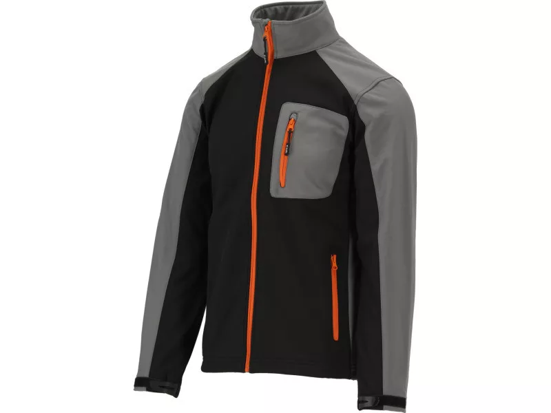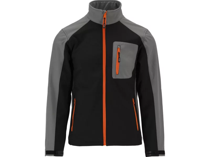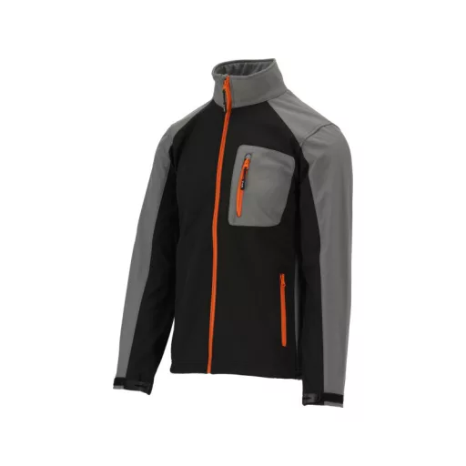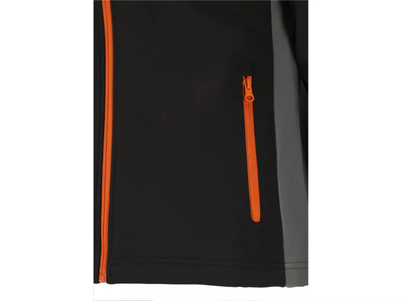 Softshell jacket with three pockets fastened with a waterproof zipper. The material is a modern three -layer and light polyester fabric with the addition of spandex with a special structure of microotwars, which block the penetration of water drops inward and at the same time allow sweat evaporation in the form of water vapor outside the material. The jacket perfectly maintains the body's warmth with comfortable air circulation and will successfully replace a heavy sweatshirt with hardly breathable fleece. The middle layer of laminate made of thermoplastic polyurethane will provide water resistance even during moderate rain. Basic data Material: 96% polyester, 4% spandex weight: 320 g/m² Work organization pocket with a waterproof zipper on the left breast two pockets with a waterproof zipper in the area of the waist in the waist area. (m² of material withstands the pressure of a 8 m high water pole - 8000 mm high) breathability 3000 MVP (about 3000 g of water/sweat will evaporate from 1 m² of material outside within 24h) Fastening with waterproof zipper sleeves ended with cuffs with a Velcro closure Adjusting the width at the bottom of the jacket with a blockage with a blockage The combination of comfort of use appreciated by ski clothing users with the functionality of work clothing meets the requirements of Regulation (EU) 2016/425 for work clothing and category. Water resistance parameter so far most often used in ski clothing expresses the resistance of the m² of material to the pressure of a millimeter of water pole. 0 - 1500 mm - almost zero water resistance, work in dry conditions 1500 - 5000 mm - water resistance for light rain and delicate snow 5000 - 10,000 mm - water resistance for moderate rain and snow 10,000 - 15000 mm - water resistance to heavy rain and snow without a large wind Breathability otherwise a couple-permeability means the ability of the material to lead sweat in the form of steam outside the material. The higher the parameter, the more effective the air circulation. Values between 2000 - 5000 MVP are a compromise between maintaining body warmth and the comfort of working in moderate physical activity, e.g. when working at a construction site.