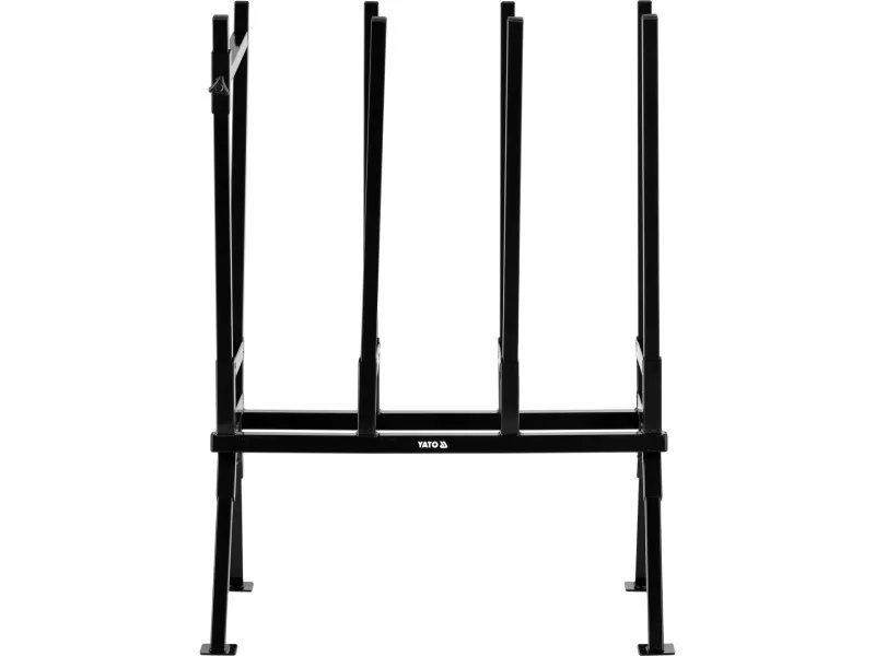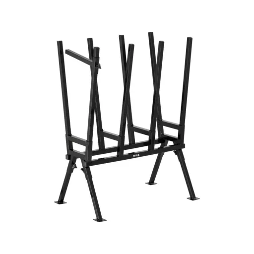 Folding stand for sawing, cutting and storing wood.
