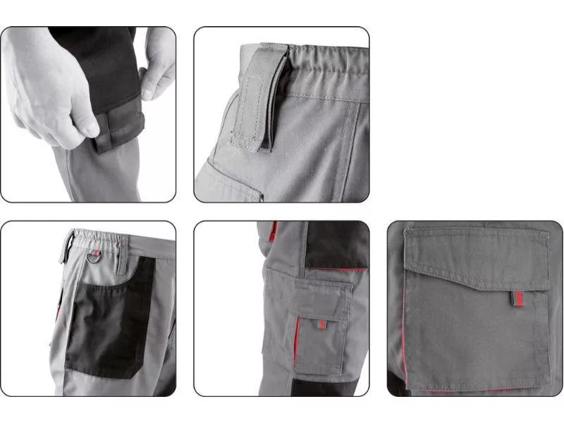 Working pants with five pockets, including three with a Velcro fastening and special pockets for penetrates. The main material is a mixture of cotton with polyester in the right proportions. This solution allows you to use the strengths of both materials, including Increased tear resistance and good air circulation. Triple seams were used for connections of the material in the most exposed places to tear. Basic data: material: 35% cotton, 65% polyester weight: 240 g/m² work organization: below belt at the front two pockets made of material with reinforced resistance to abrasion on the left leg large pocket with a flap, fastened with Velcro below the waist below the waist two belt two Large pockets with a flap, fastened with Velcro, made of material with reinforced resistance to abrasion at the front of the front eyebone with keys at the back of the belt at the back Intended for nonsense inserts, e.g. 74595 Additional information: Triple seams in places exposed to tear, fastened with a zipper and button in the waist adjustment width with waist width with buttons in the waist on the waist on the sides. Sewn tight gum meets the requirements of regulation (EU) 2016/425 for clothing working and category. & nbsp;