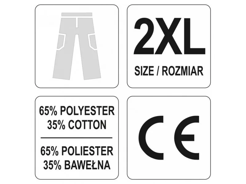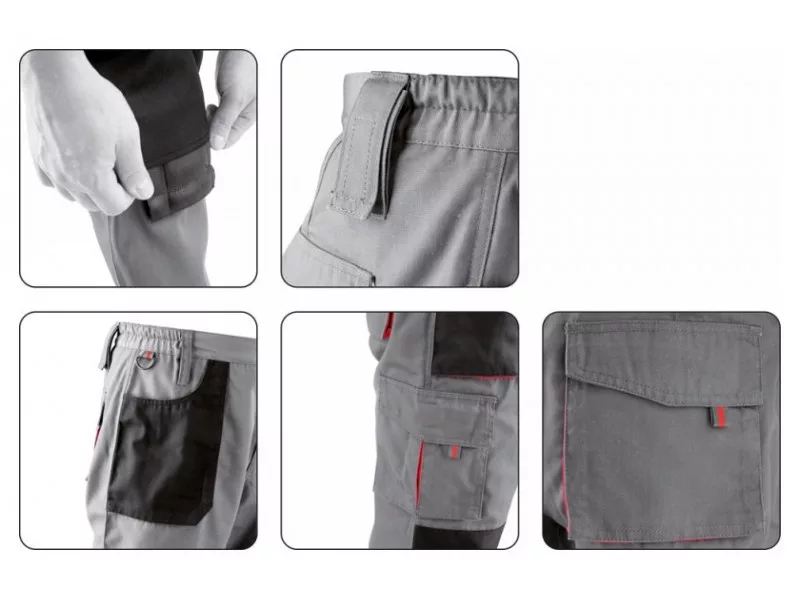 Working pants with five pockets, including three with a Velcro fastening and special pockets for penetrates. The main material is a mixture of cotton with polyester in the right proportions. This solution allows you to use the strengths of both materials, including Increased tear resistance and good air circulation. Triple seams were used for connections of the material in the most exposed places to tear. Basic data: material: 35% cotton, 65% polyester weight: 240 g/m² work organization: below belt at the front two pockets made of material with reinforced resistance to abrasion on the left leg large pocket with a flap, fastened with Velcro below the waist below the waist two belt two Large pockets with a flap, fastened with Velcro, made of material with reinforced resistance to abrasion at the front of the front eyebone with keys at the back of the belt at the back Intended for nonsense inserts, e.g. 74595 Additional information: Triple seams in places exposed to tear, fastened with a zipper and button in the waist adjustment width with waist width with buttons in the waist on the waist on the sides. Sewn tight gum meets the requirements of regulation (EU) 2016/425 for clothing working and category. & nbsp;