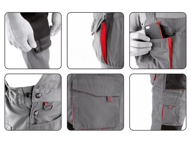 Working pants on braces such as gardens with seven pockets, including five with a Velcro closure and special pockets for nutrients. The main material is a mixture of cotton with polyester in the right proportions. This solution allows you to use the strengths of both materials, including Increased tear resistance and good air circulation. Basic data: material: 35% cotton, 65% polyester weight: 240 g/m² work organization: on the breast two pockets including one with a path, fastened with Velcro below the belt at the front two pockets of material made of material with reinforced resistance to abrasion on the left leg A large pocket with a flap, fastened with Velcro on the back below the waist two large pockets with a flap, fastened with Velcro, made of material with reinforced resistance to abrasion at the front of the front eye for a carabinf Nakhatolanary inserts, e.g. 74595 Additional information: double seams in places exposed to tear, fastened with zip with a zipper, adjustment of the width at the waist with buttons in the belt, sewn -in gum tightening fabric braces with a flexible tape on the back of the rear solid fastener with adjustment of the length of the braces meet the requirements of regulation (EU) 2016/425 for work clothing and category.