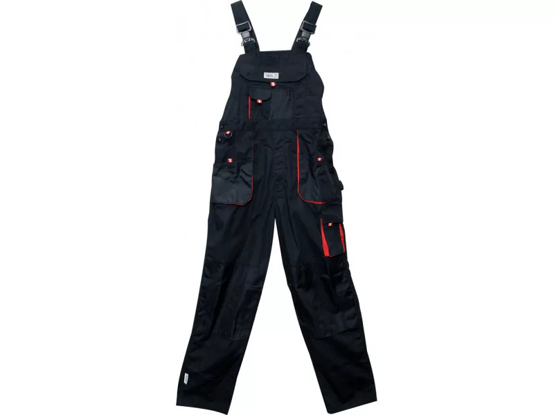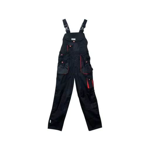Work trousers with braces, dungaree type, with eleven pockets, including seven with Velcro fastening and special pockets for knee pads.