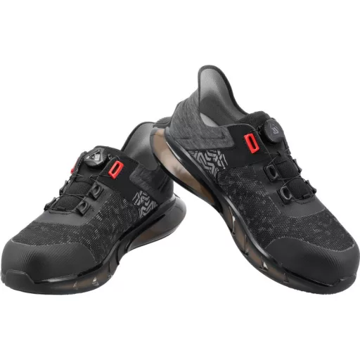 Innovative three-material outsole. The outer, semi-transparent part made of TPU not only has aesthetic qualities but also serves as an air cushion around almost the entire perimeter. It guarantees increased comfort while working in non-standard positions. The inner part made of responsive ETPU supports the foot entirely and excellently absorbs vibrations. The slip-resistant tread made of rubber improves stability on surfaces covered with detergents as well as oily substances, which is confirmed by receiving the SR certification. Enhanced user comfort is complemented by an innovative popcorn design insole.