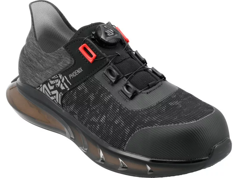 Lightweight work shoes from the PHOENIX S1PL series feature a durable fiberglass toe cap and a flexible aramid anti-puncture insole with an additional anti-static thread. The fiberglass toe cap is one of the lightest on the market and takes up less space for the toes compared to its composite counterpart. It does not absorb ambient temperature, which is appreciated both in winter during frosts and on hot days. The anti-puncture insole, unlike its steel equivalent, is flexible and does not restrict midfoot bending.