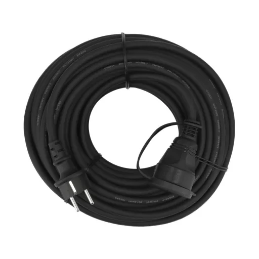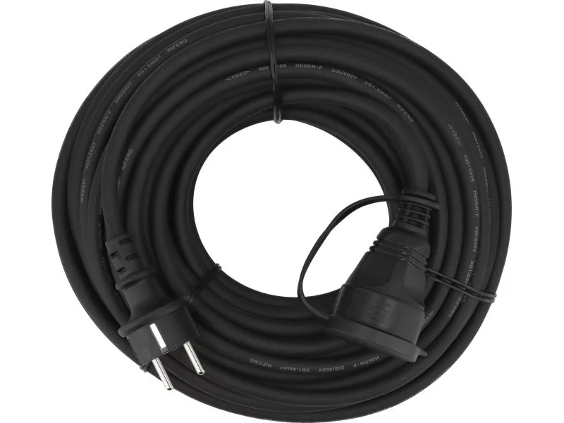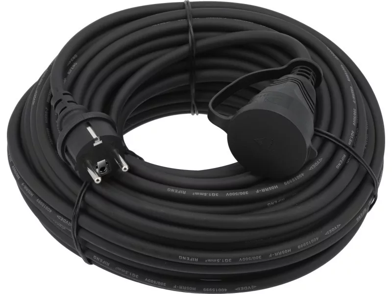 Building extension cable with dust and splash-proof socket. The chlorinated polyethylene (CPE) sheathed cable will work well both indoors and outdoors. It is resistant to oils, acids, most solvents and sunlight. It does not stiffen in the cold. Does not spread fire. It is characterised by high resistance to ageing.