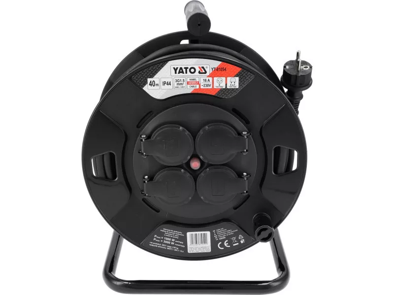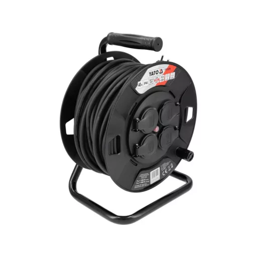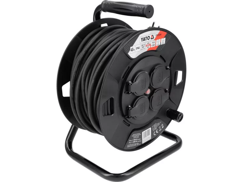 Construction reel extension cord YT-81054 with a length of 40 meters with 4 dust- and splash-proof outlets, thermal protection and child protection. Natural rubber sheathed cable wound on a drum made of durable plastic makes the extension cord suitable for indoor as well as outdoor use, such as on construction sites, in gardens, in yards in front of factories.