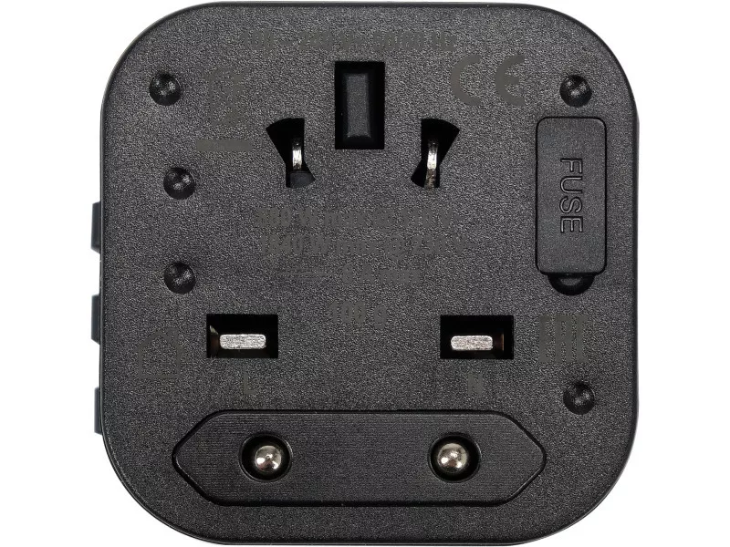 Removable plugs with a locking mechanism that prevents the pins from sliding back into the housing. Adapter protected against short-circuit by an easily accessible ceramic fuse. Housing made of durable flame-retardant plastic.