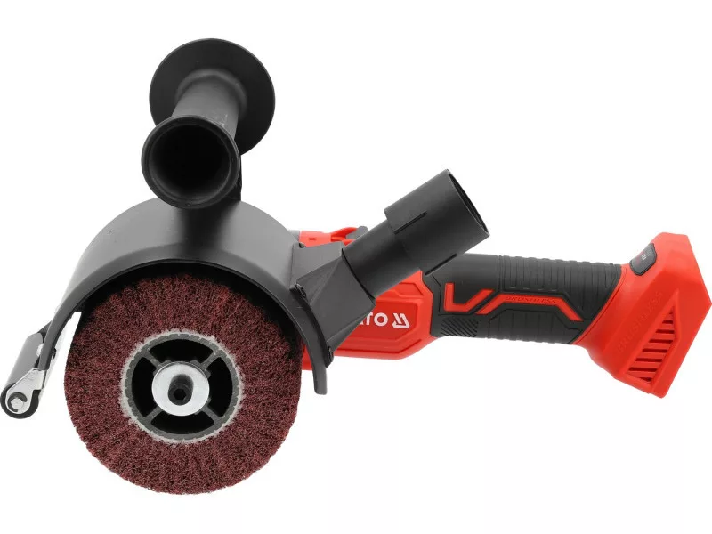 The cordless sander is designed for surface treatment using drum brushes, allowing for sanding, cleaning, and structuring of materials. Depending on the brush used, the tool is effective when working with wood, metal, and selected synthetic materials. The device enables the removal of paint coatings, prepares surfaces for further processing, and also creates a satin or aging effect on the material. It is a practical tool for renovation, carpentry, and locksmithing tasks, allowing for quick surface preparation and achieving a decorative material structure.