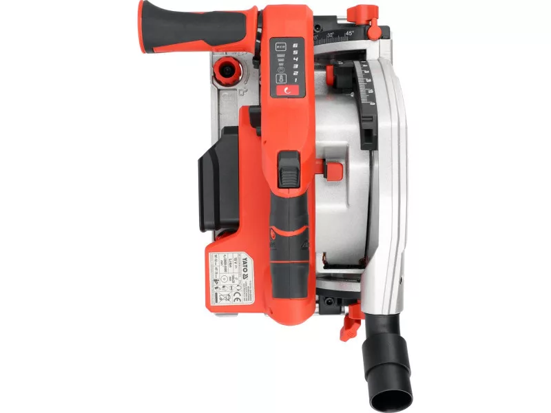 Brushless cordless plunge saw designed for precise cutting of wood and wood-based materials such as plywood, particle boards, MDF, or laminates using circular saw blades. The tool's design allows for straight cuts from the edge of the material as well as plunge cutting mode, enabling work to begin at any point on the workpiece. With the use of a parallel guide and a rail guide, it is possible to guide the tool along a stable line, facilitating accurate and repeatable results (rail and clamps included).