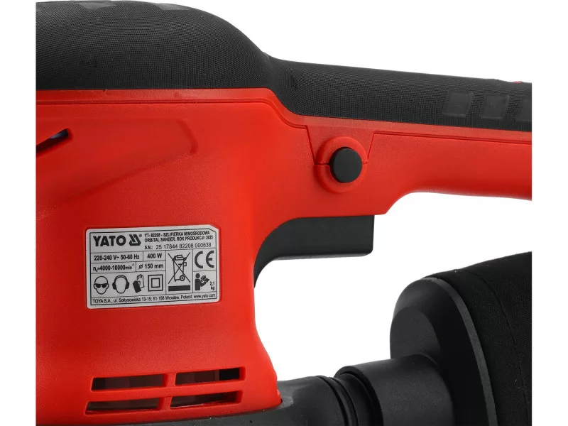 The YATO orbital sander with a disc diameter of 150 mm is a tool designed for users who demand high-quality surface finishing and stable working parameters. The 5 mm stroke eccentric increases material removal dynamics, resulting in faster sanding while maintaining an even surface structure. The compact design combines efficiency, rotational control, and ergonomics, allowing for the effective execution of a wide range of sanding tasks – from initial material removal to smoothing and precise dry finishing of wooden, lacquered, composite elements, and filler materials, including gypsum.