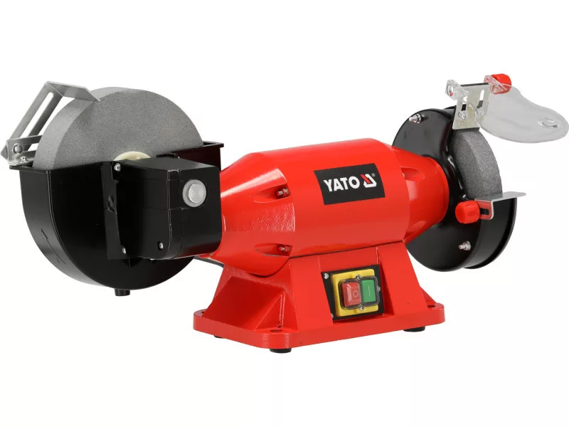 The double-disc bench grinder allows grinding, sharpening and polishing of tools, as well as cleaning and deburring. It is designed for wet and dry work in the workshop. The possibility of installing it on workbenches provides stability and comfort, and the dust extraction connection ensures effective collection of excavated material.