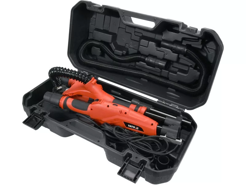 Grinder on an extension arm designed for grinding gypsum drywall and mesh backing plaster used in polystyrene insulation systems. The extension arm makes it easy to grind walls and ceilings up to a height of 4 m without the need for platforms and ladders.