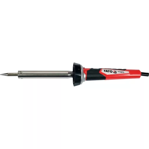 A flask soldering iron YT-8273 in a traditional housing with a resistance heater powered directly from a wall outlet. The simplicity of the design makes the device almost failure-free, and with proper care of the soldering iron tip will serve for many years. The power of the heater is sufficient to properly solder two copper wires, basic electronics in through-hole assembly technology or for work involving the connection of stained glass elements, jewelry using the Tiffany method. The high-quality coated copper tip ensures faster heat accumulation and dissipation than standard tips, and the touch-friendly two-component handle with an anti-slip element further improves safety in use.