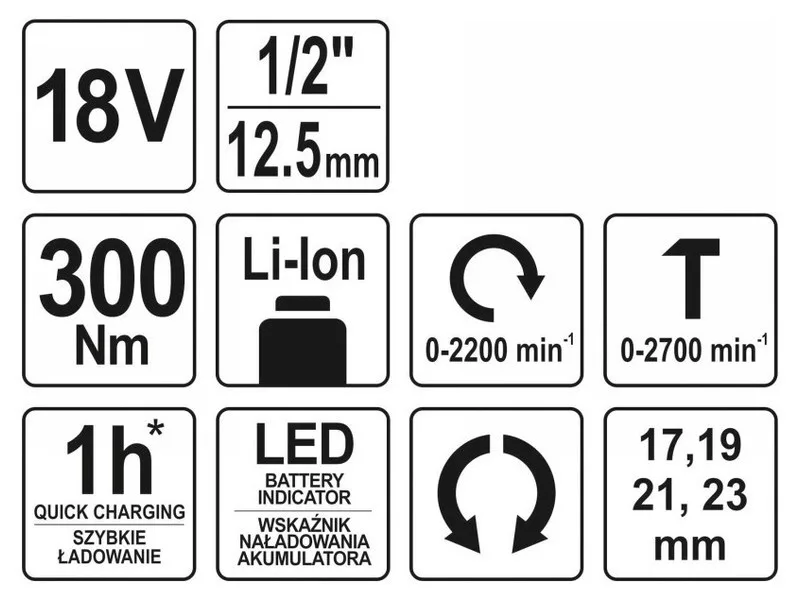 | Set includes | impact wrench, impact socket x4 (17 mm, 19 mm, 21 mm, 23 mm) |