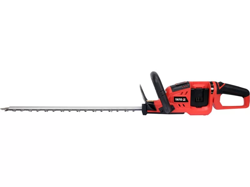 A cordless hedge trimmer powered by two 18V batteries and driven by a brushless motor. They give the user power that often exceeds that of internal combustion engines, quiet operation and freedom from the cumbersome extension cord of electric shears. The high speed of the cutting blades makes it much easier to work with fresh shoots and branches up to 28mm thick. 22" long laser-cut blade with T-shield. Swivel handle allows the user to select a comfortable cutting plane. Soft rubberized handle provides a secure hold on the tool while working. Storage is facilitated by a hanger located at the end of the shears. On two 4 Ah batteries, the shears run for about 1 h.