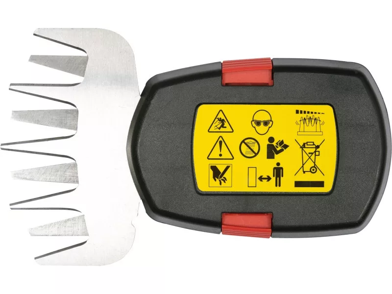 Lightweight battery-powered grass shears. The compact shape allows precise manoeuvring when cutting grass and twigs. The shears are equipped with a front blade for grass and a side blade for pruning shrubs. The blades are made of high-quality carbon steel, ground and have a high corrosion resistance. Blade replacement is tool-free and intuitive. Knife sharpening is possible using grinding stones fitted to the screwdriver.