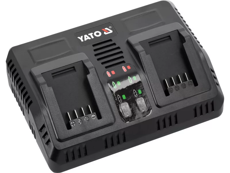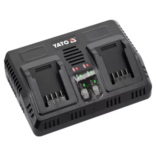 Dual charger for all YATO 18-volt system aculmulators. It charges both two batteries simultaneously and individually. A built-in battery performance and temperature testing system takes care of battery life. Does not start charging when cells are too hot. In the case of a battery stored in a negative temperature, it starts charging when the battery reaches a temperature above +5 degrees Celsius.