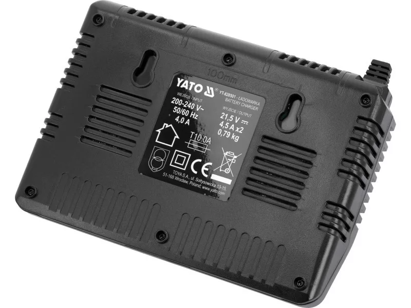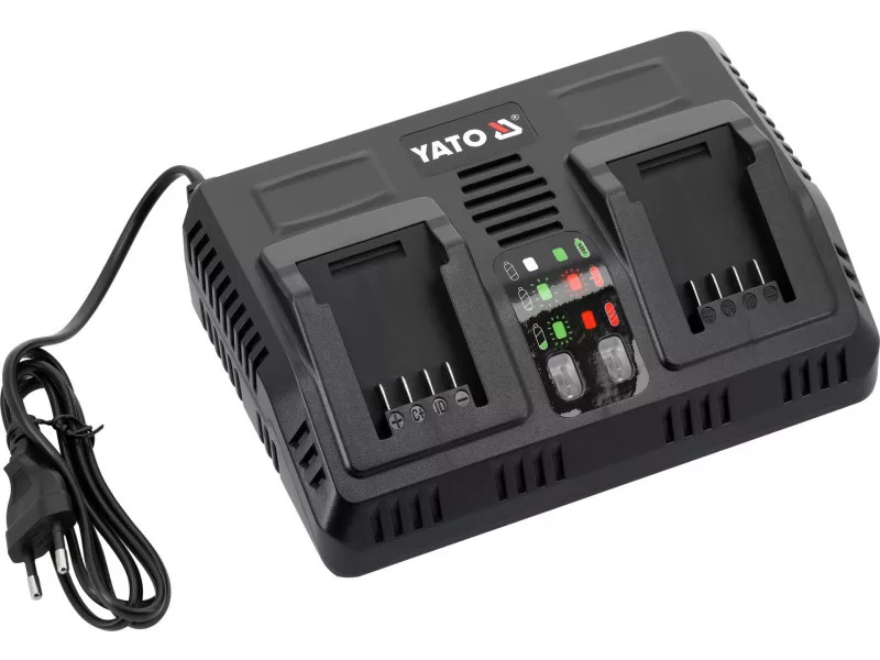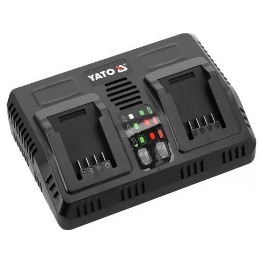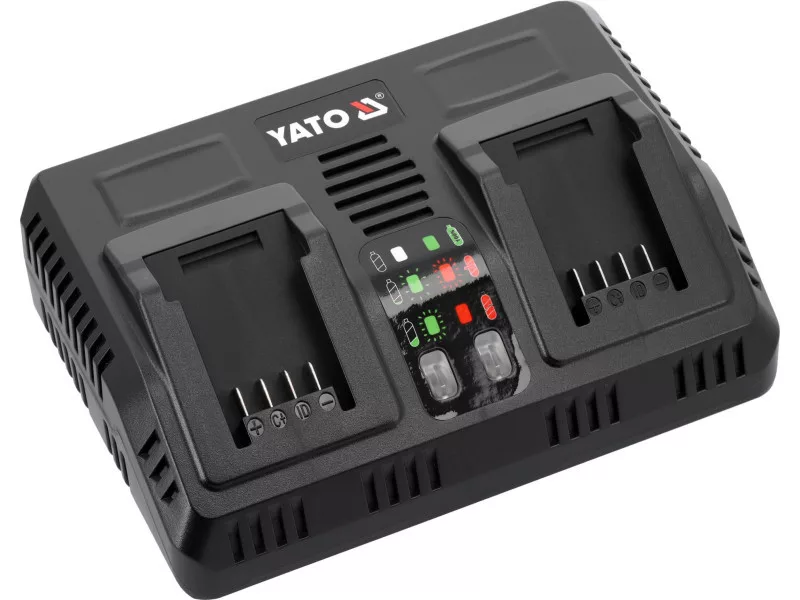 Fast dual charger for all YATO 18-volt system aculmulators. A built-in battery performance and temperature testing system takes care of battery life. Does not start charging when cells are too hot. In the case of a battery stored in a negative temperature, it starts charging when the battery reaches a temperature above +5 degrees Celsius.