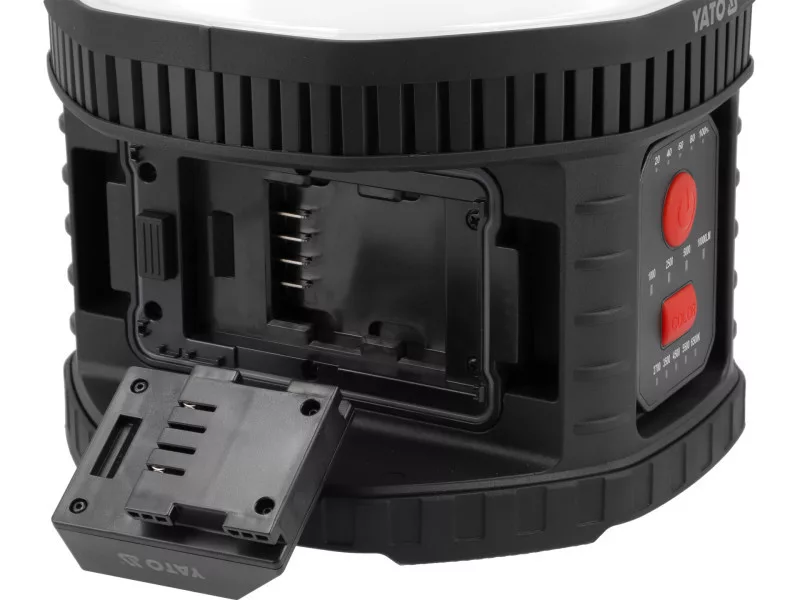 The spotlight operates powered by mains or YATO 18 V platform batteries. Unlike many other models that lose power in mains mode, the YT-829670 lamp provides the same light intensity (lumens) regardless of the power source. Additionally, thanks to adapters, it allows work on batteries of other types.
