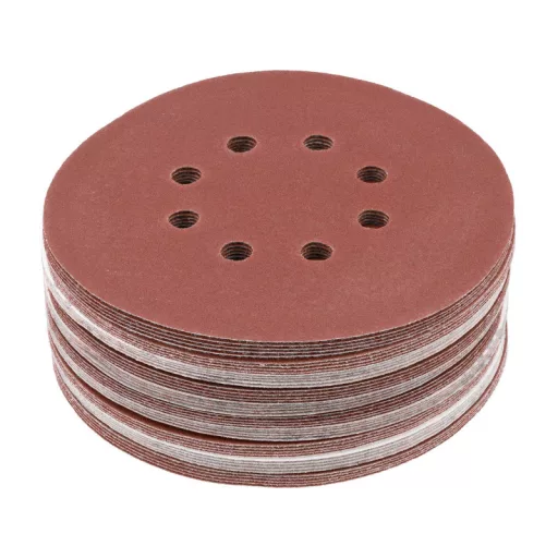 8 HOLE, 150MM DIAMETER, grit 150, MATERIAL: ALUMINIUM OXIDE, BACK: HOOK FASTENER,50PCS, BOND: EPOXY RESIN, EMBOSSING: SEMI-OPEN. SIX-HOLE ABRASIVE DISCS ARE DESIGNED FOR SANDING PAINT, VARNISH, WOOD AND METAL SURFACES. CO-OPERATE WITH OSCILLARY AND MIMMILLARY SANDERS YT-82207, YT-82206
