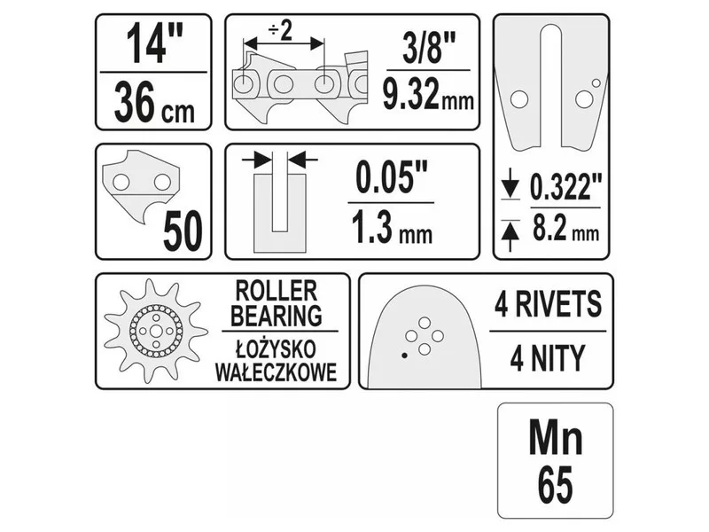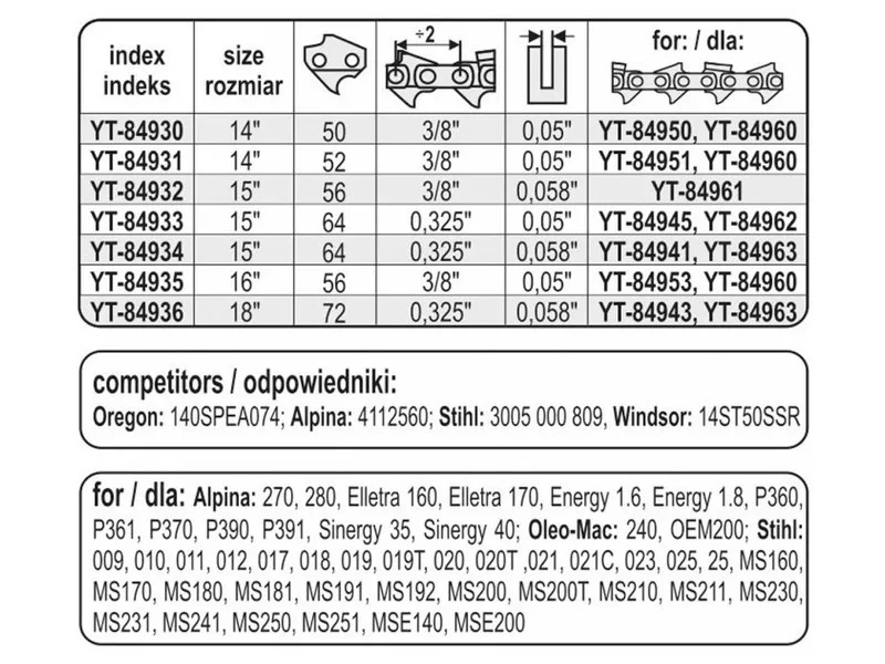 It is suggested to use the guides with YATO YT-84950 or YT-84960 chains. It is also possible to use them with chains from other manufacturers.
