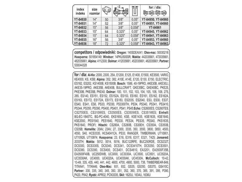 YATO guides are designed for home and professional use. They are dedicated to work around the house, in the garden. They are also successfully suitable for logging work. It is suggested to use the guides with chains YATO YT-84951 or YT-84960.It is also possible to use them with chains from other manufacturers.