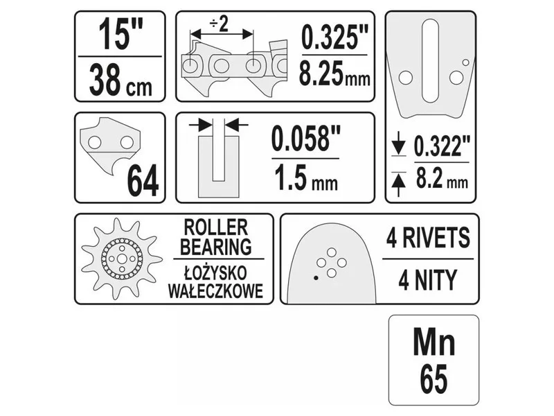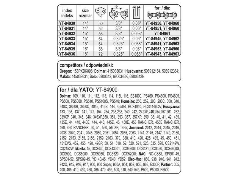 YATO YT-84934 guide bar is designed for use with, among others, YATO YT-84900 chainsaw.It is suggested to use the guides with YATO YT-84941 or YT-84963 chains.It is also possible to use them with chains from other manufacturers.