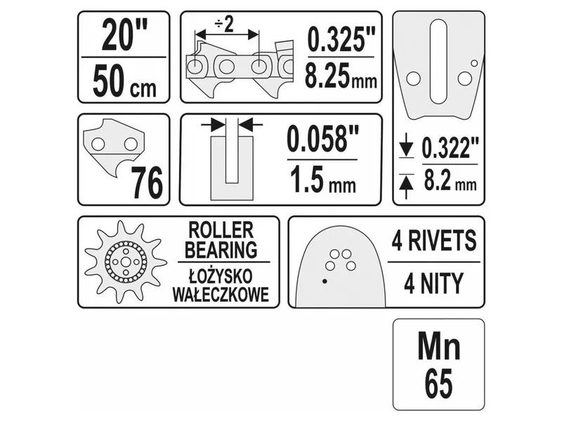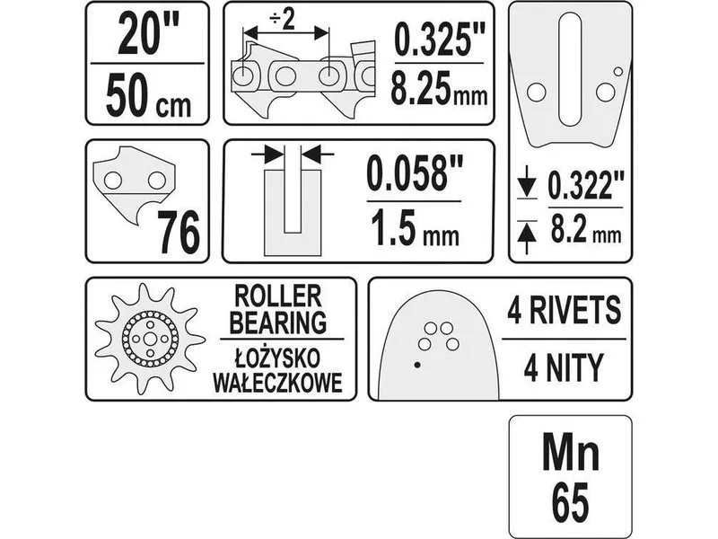 Length 20", 76 links, pitch 0.325", width 0.058" (1.5 mm).