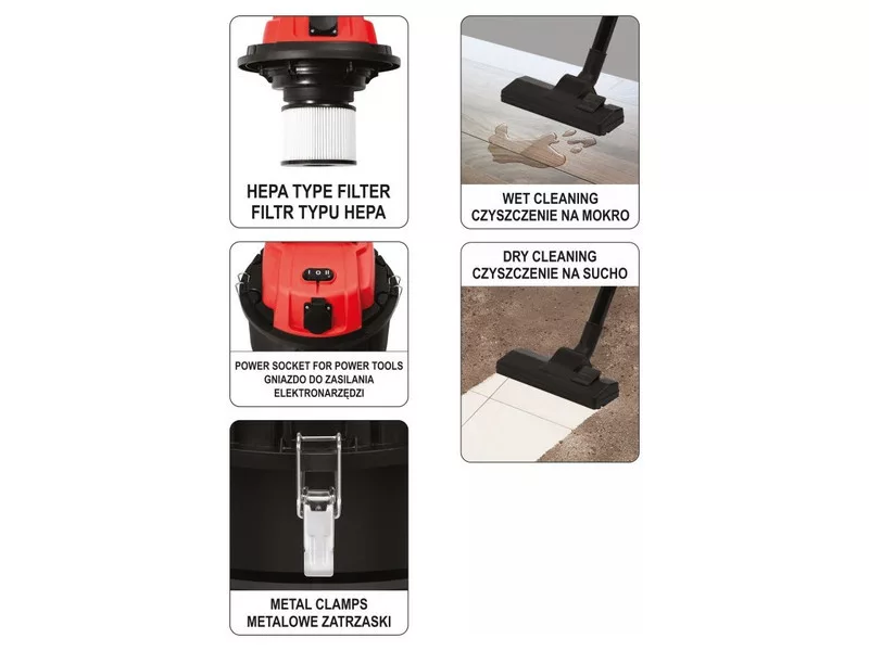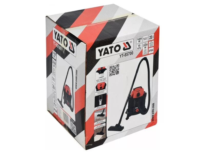 YATO workshop vacuum cleaner with 1400W power and 18 kPa suction power. It has a tank with a capacity of 20 L. The vacuum cleaner is equipped with a telescopic, anti-static tube. It also has a built-in socket, allowing it to power power tools. It allows wet and dry work. It can also be used as a blower.