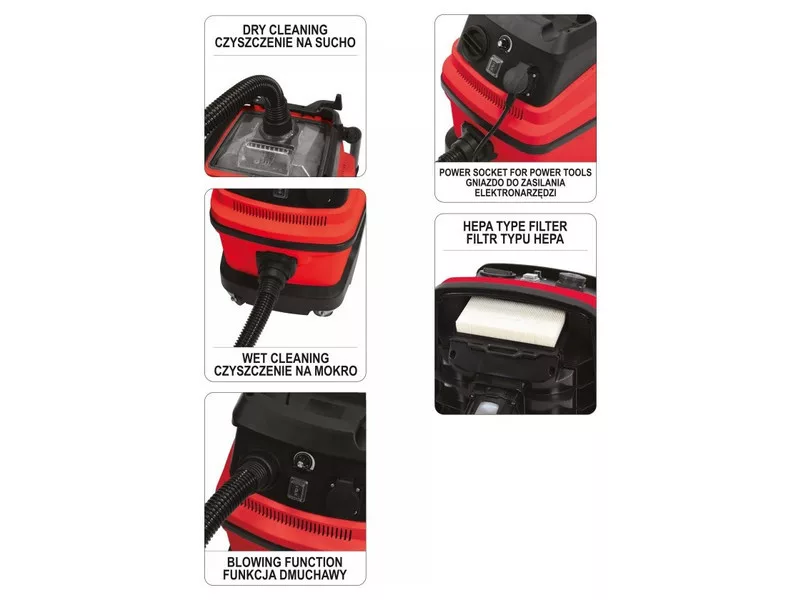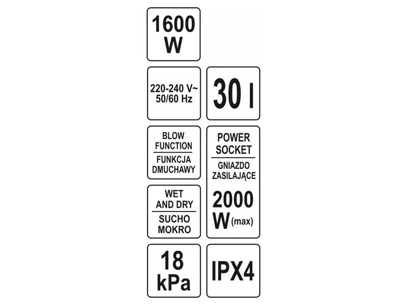 YATO professional industrial vacuum cleaner with 1600W and 18 kPa suction power. It has a 30 L tank. The vacuum cleaner can work wet and dry. Equipped with a blower function.