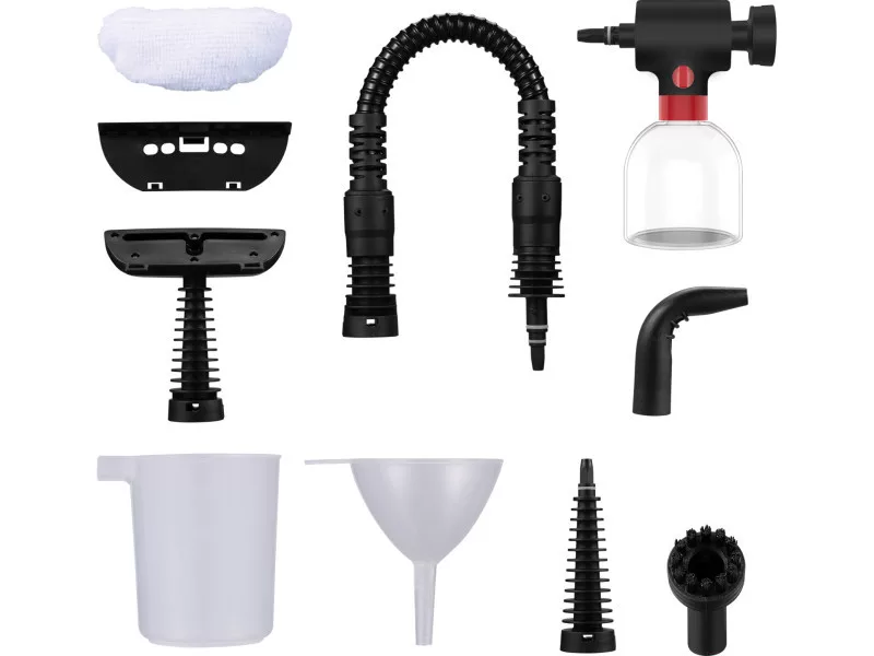 | Set includes | steam cleaner, flexible nozzle 55 cm, water container (measuring cup), funnel, microfiber cover, bristle brush, glass cleaning tip, holder for a window tip, tip with a brush, |