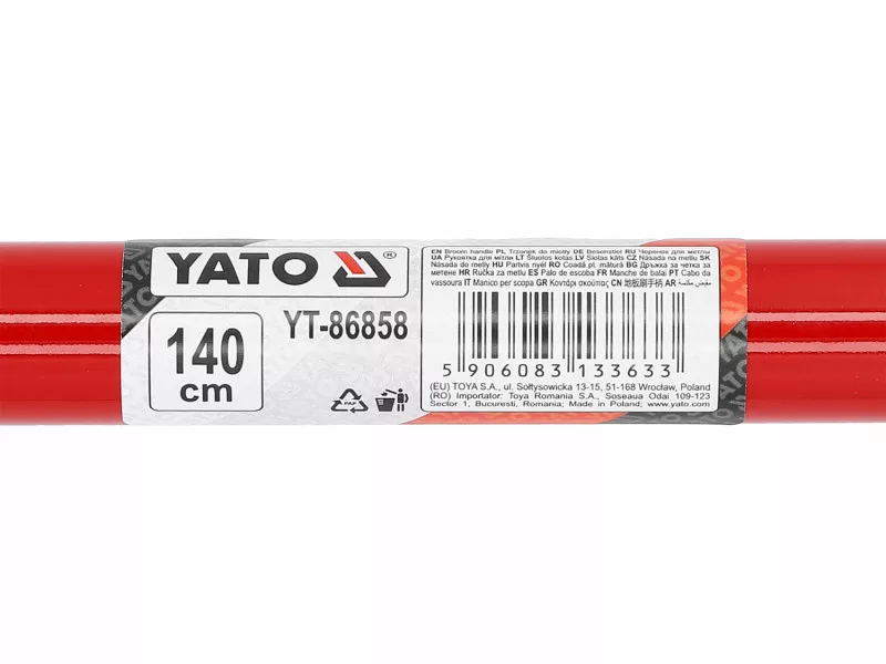 Solid steel sheet coated with plastic handle, finished with a conical thread. Suitable for brooms YT-86854, YT-86855, YT-86856, YT-86857.