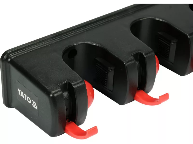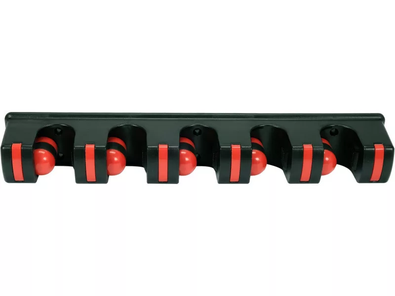 Practical wall-mounted hanger for garden and household tools. It has 5 automatic handles that adjust to the thickness of the handle and 6 hooks. The pressure of the handles is spring-loaded, which allows you to conveniently hang and pull out tools. The hooks can be folded perfectly facing the surface of the hanger.