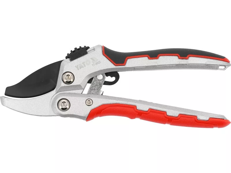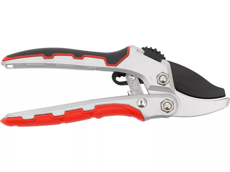 Forged aluminum pruning shears, 190 mm long, with a ratchet mechanism that enhances cutting force without straining the hands. Designed with comfort, precision in daily work, and user safety in mind. The opening lock protects against unwanted use. The handle made of a lightweight and durable aluminum alloy, combined with strong ABS and soft TPR, fits perfectly in the hand, minimizing fatigue during cutting.
