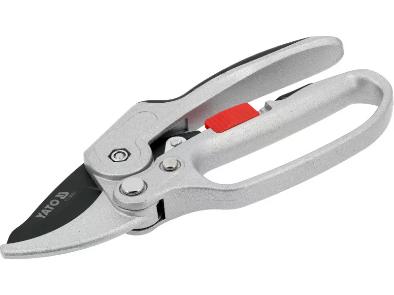 Forged aluminum pruning shears, 200 mm long, with a ratchet mechanism that enhances cutting force without straining the hands. Designed with comfort, precision in daily work, and user safety in mind. The opening lock protects against unwanted use, and the finger guard eliminates the risk of accidental injury. The handle made of lightweight and durable aluminum alloy, combined with tough ABS and soft TPR, fits perfectly in the hand, minimizing fatigue during cutting.
