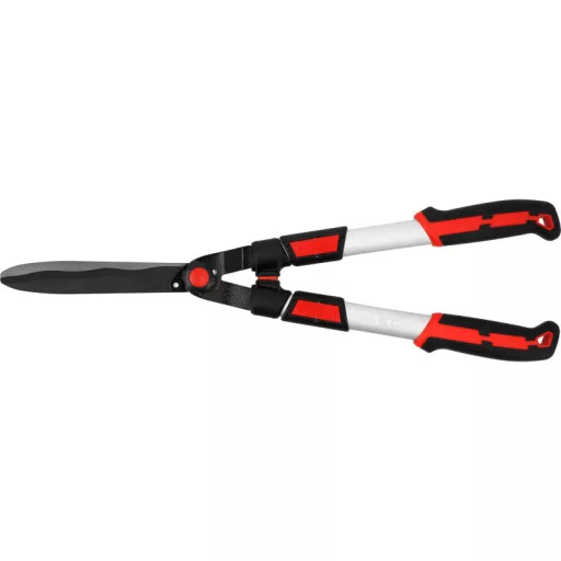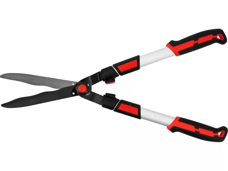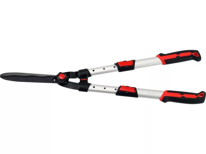 Telescopic hedge shears with adjustable length from 660 to 825 mm allow for comfortable trimming of hedges at different heights. The wavy blades, 220 mm long, made of resistant 65 Mn carbon steel, covered with PTFE at the top, ensure precise and clean cutting of branches up to 6 mm in diameter, facilitating the daily maintenance of garden shrubs and shaping the hedge.