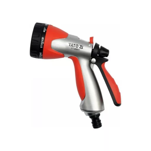 The sprinkler gun with 8 types of spray, has adjustable flow rate and a locking device for continuous operation.
